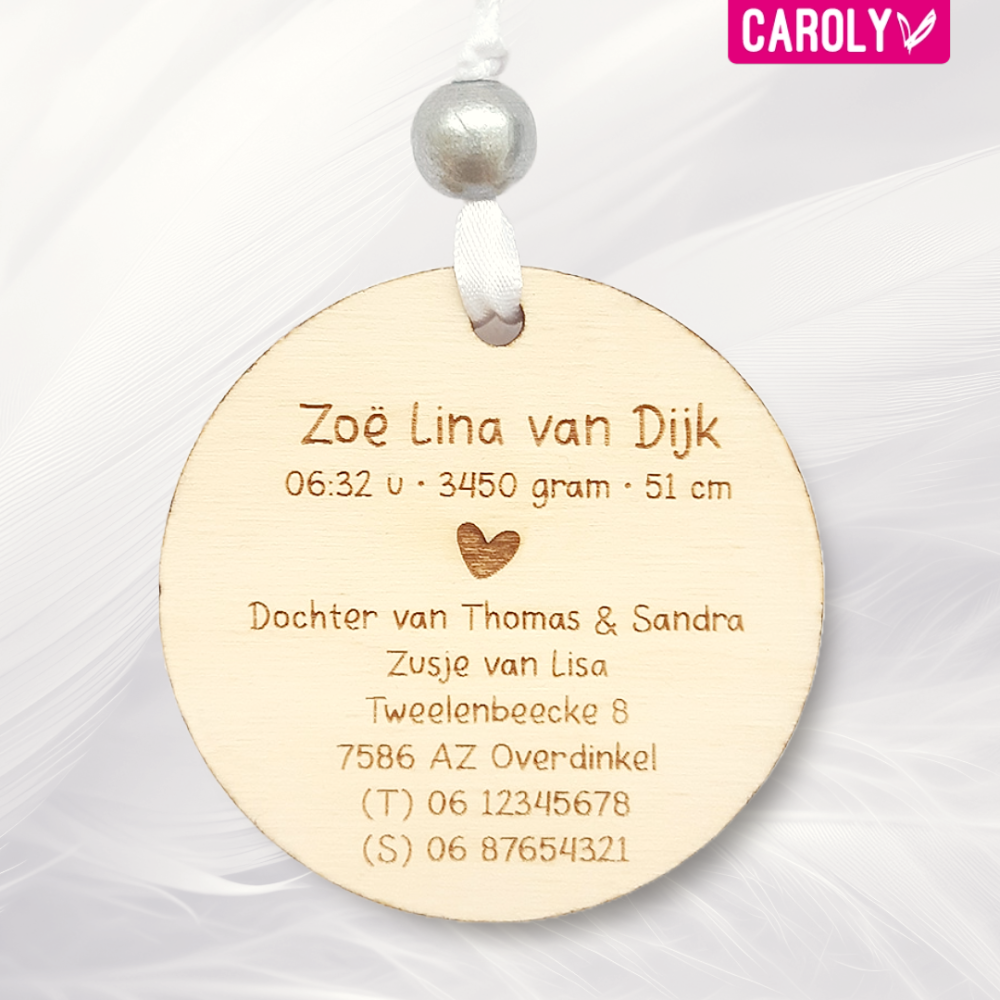 Witte lintjes en kralen (kleur naar keuze) worden los meegeleverd.