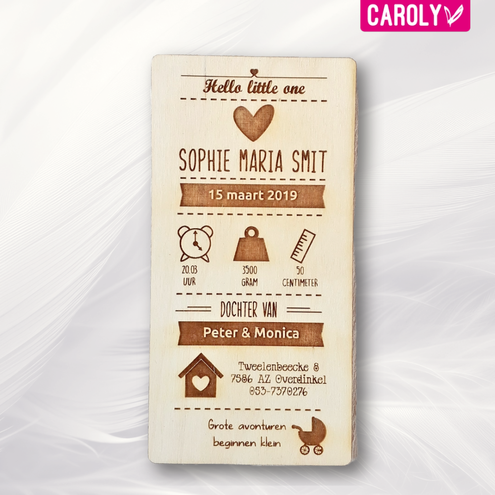 Hip geboortekaartje van hout, leverbaar in diverse formaten.