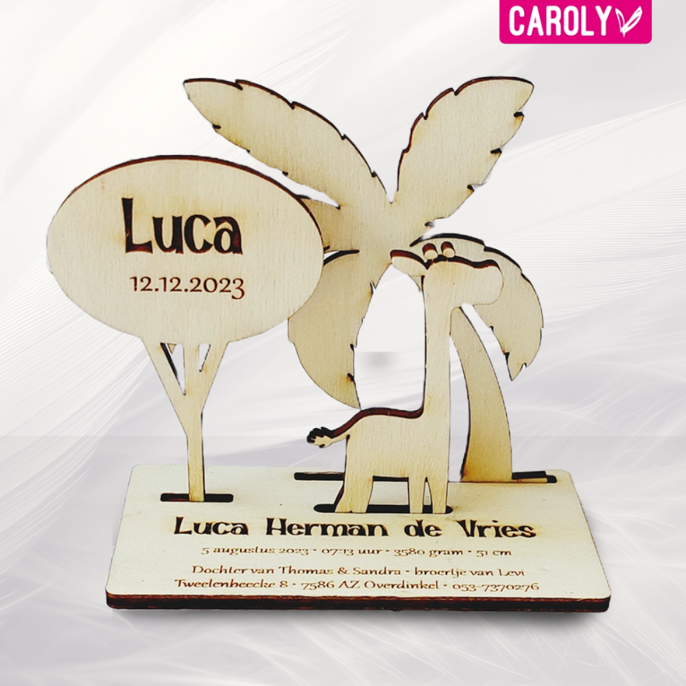Uniek geboortekaartje van hout met jungle thema.
