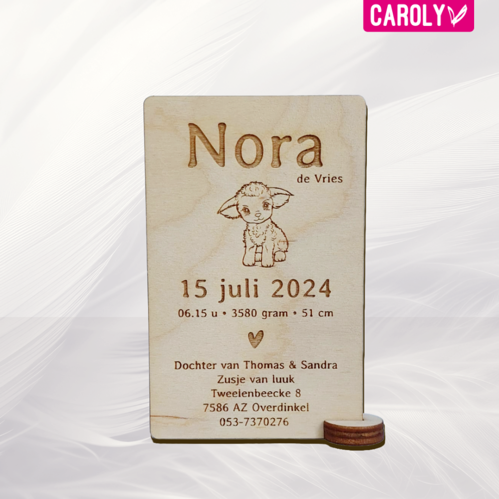 Dit leuke houten geboortekaertje is 65x100mm en biedt ruimte voor alle basis gegevens.