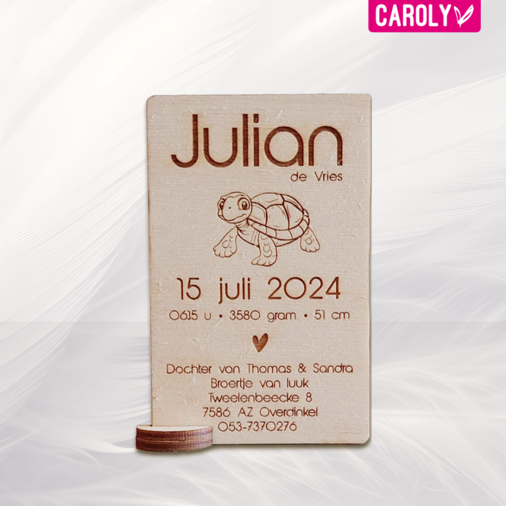 Dit leuke houten geboortekaertje is 65x100mm en biedt ruimte voor alle basis gegevens.