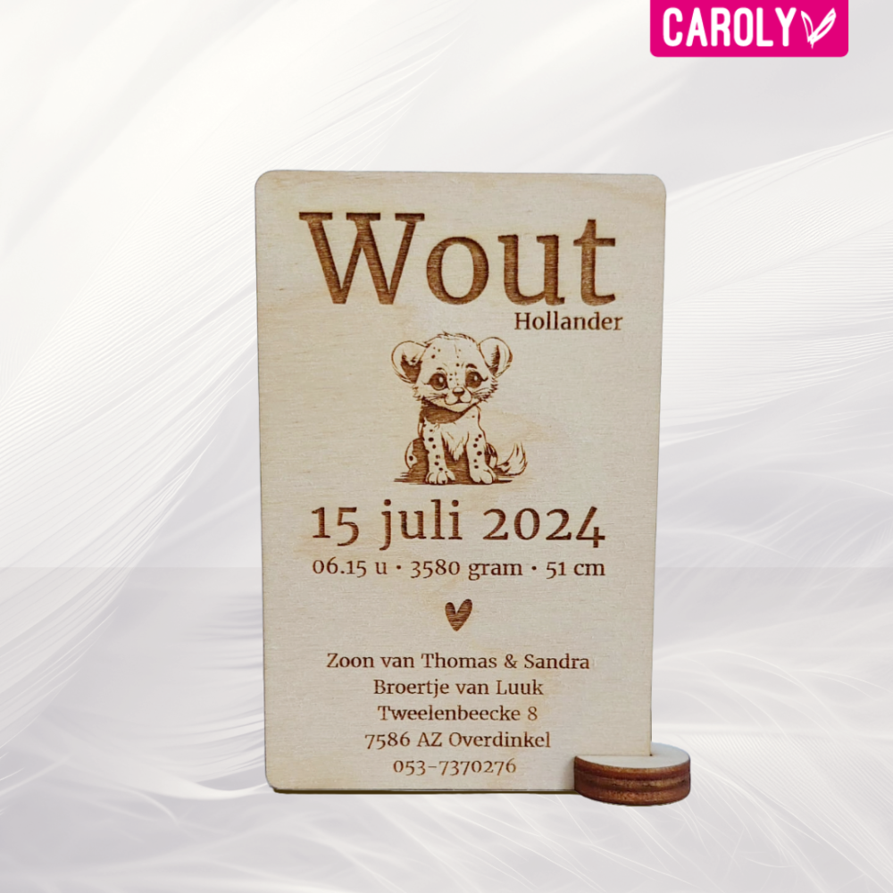 Dit leuke houten geboortekaertje is 65x100mm en biedt ruimte voor alle basis gegevens.