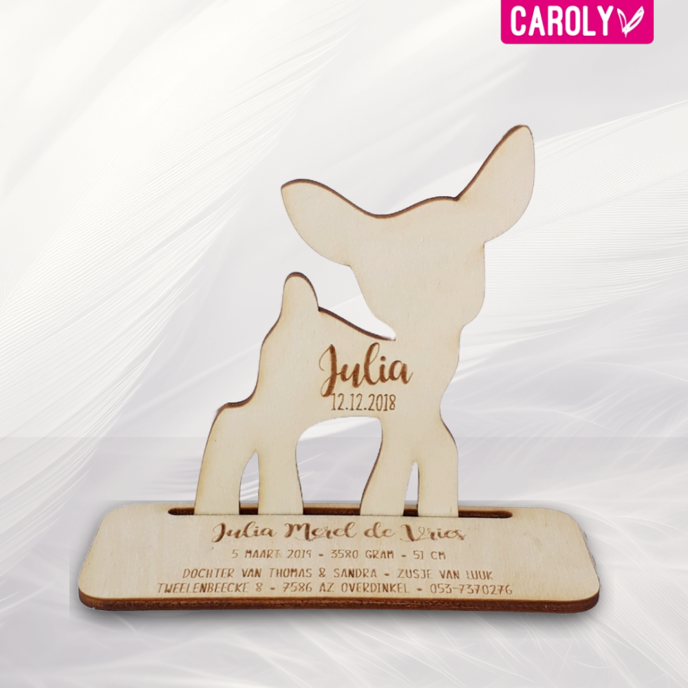 Lief geboortekaartje van hout in de vorm van een hertje.