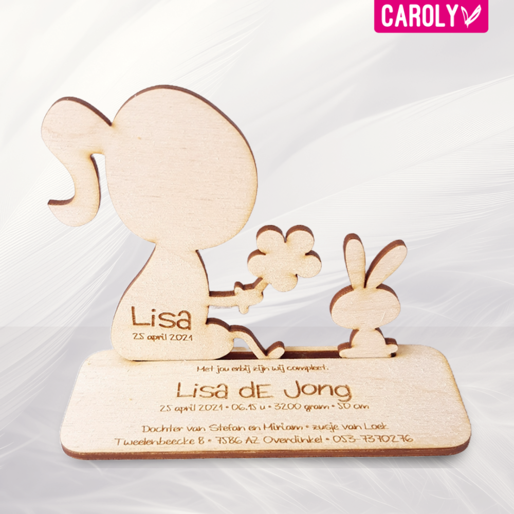 Lief geboortekaartje van hout in de vorm van een meisje met konijntje.