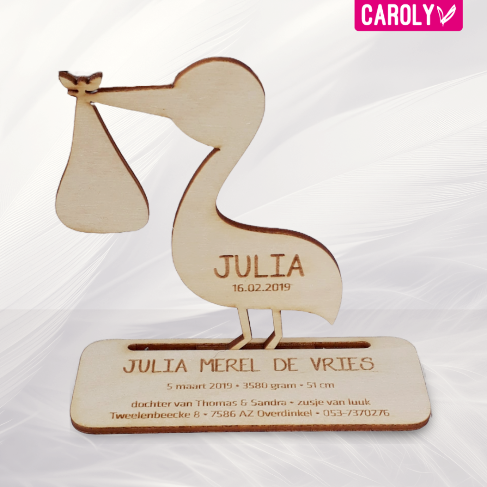 Leuk geboortekaartje van hout in de vorm van een ooievaar.