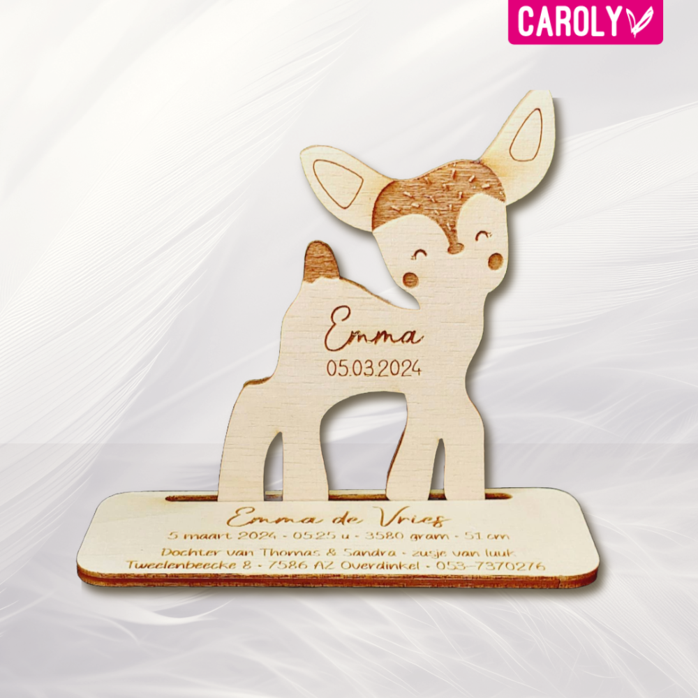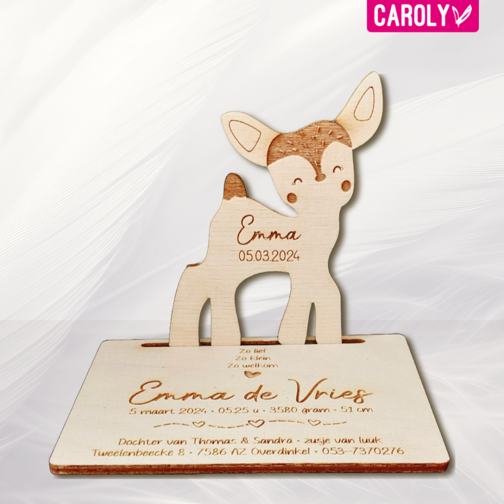 Lief geboortekaartje van hout in de vorm van een hertje.