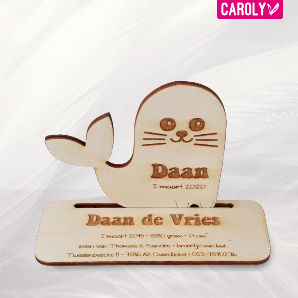 Lief geboortekaartje van hout in de vorm van een zeehondje.