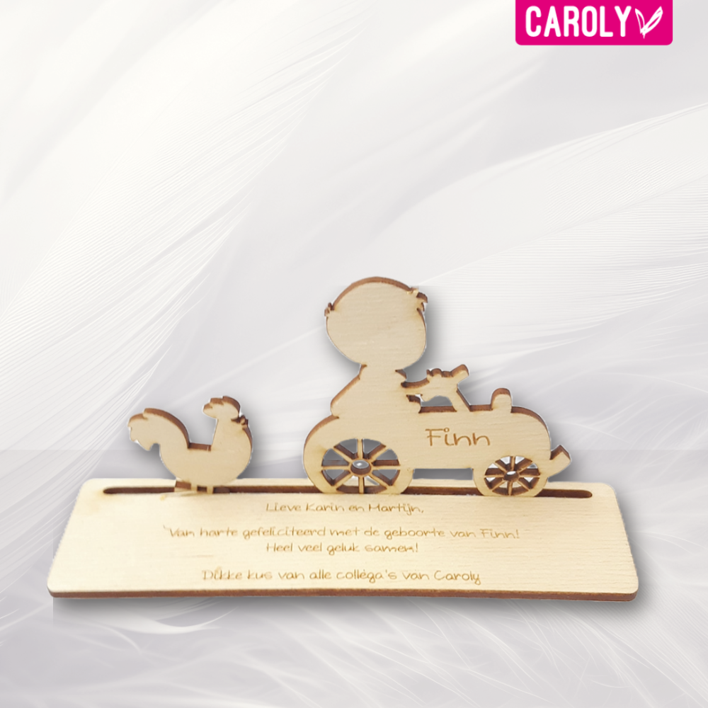 Dit leuke kaartje bestaat uit een kippetje en houten tractor (7cm hoog) met naam, die in het onderplaatje kunnen worden gezet.
