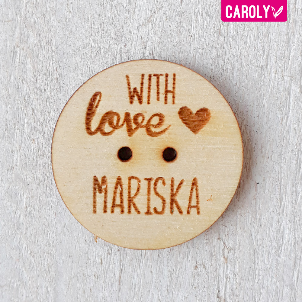 Maak je creatie helemaal af met deze leuke houten knopen met tekst "with love" en je eigen naam.