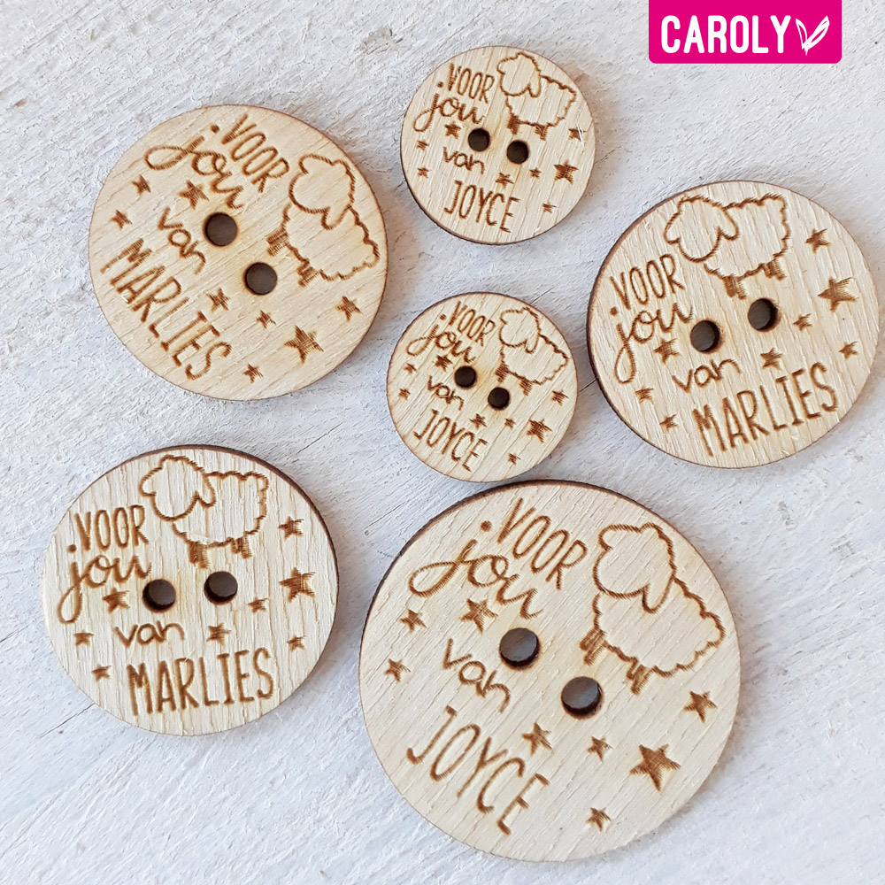 Maak je creatie helemaal af met deze leuke houten knopen met schaapje en tekst "voor jou van" en je eigen naam.