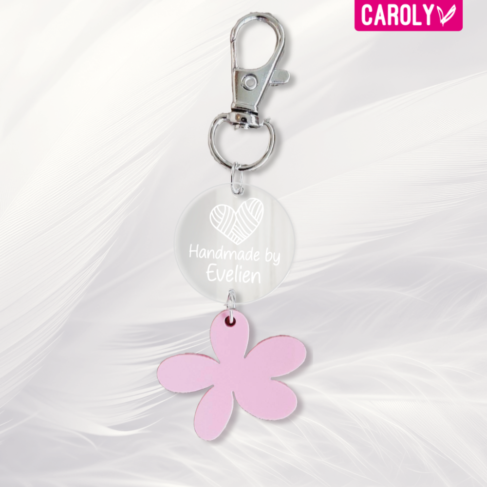 Tashanger "handmade by" met je eigen naam. Voor de kleur van het bloemetje kan worden gekozen uit zilver glitter, goud glitter, lichtroze of wit. Liever een ander kleurtje of figuurtje? Neem dan even contact op.